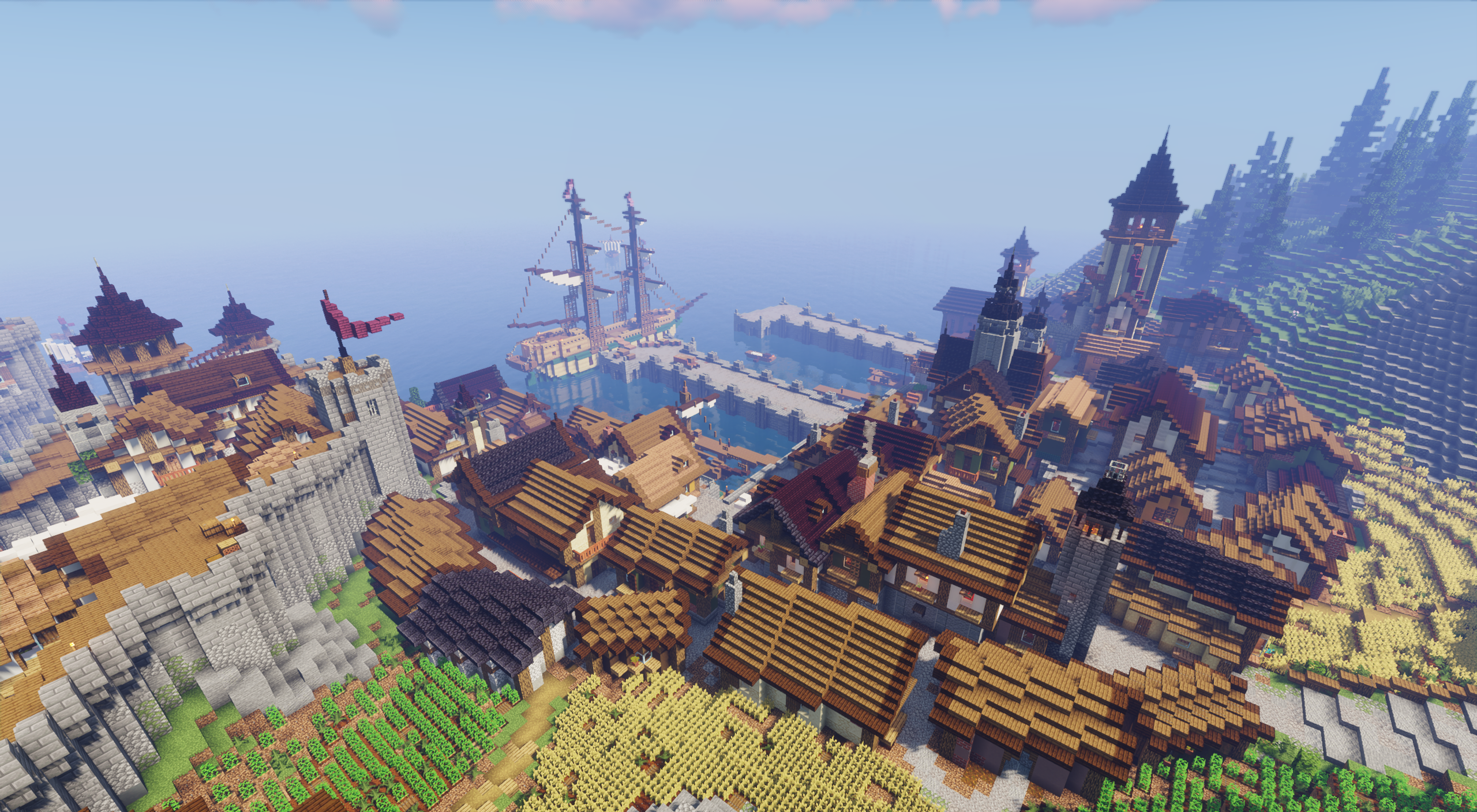 Epic Medieval Kingdom — это не просто карта, а полноценный мир для жизни. Пространство в 2000×2000 блоков наполнено множеством локаций, каждая из которых выглядит как отдельная история. Два замка поражают величием залов и архитектурой, оживлённый портовый город кипит жизнью, а на улицах можно встретить уютные таверны, где словно слышатся смех и звон кружек. Деревни и фермы создают ощущение спокойствия и уюта, что особенно контрастирует с монументальностью замков.