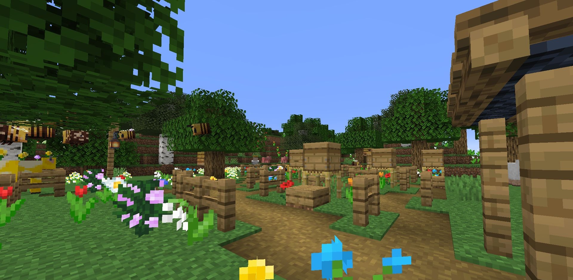Мод Beekeeper Hut добавляет в мир уютные хижины пчеловодов, оживляя луга и цветочные леса. В каждой хижине живёт NPC-пчеловод, который предлагает сделки, связанные с мёдом и пчёлами. Игроки могут торговать, разводить пчёл и собирать ресурсы, превращая обычные биомы в настоящие пасеки. Новая структура выглядит естественно и гармонично вписывается в окружение, делая мир более живым.