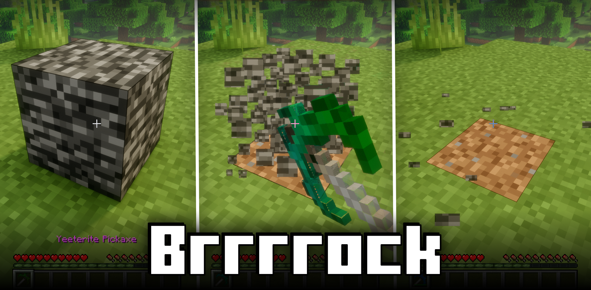 Разрушение коренной породы в выживании звучит почти как читерство, но мод Brrrrock делает это аккуратно и продуманно. Он вводит новый материал — Йитерит, из которого можно создать кирку, способную ломать почти всю коренную породу. При этом нижний слой остаётся нерушимым, что сохраняет структуру мира и не позволяет случайно попасть в пустоту.