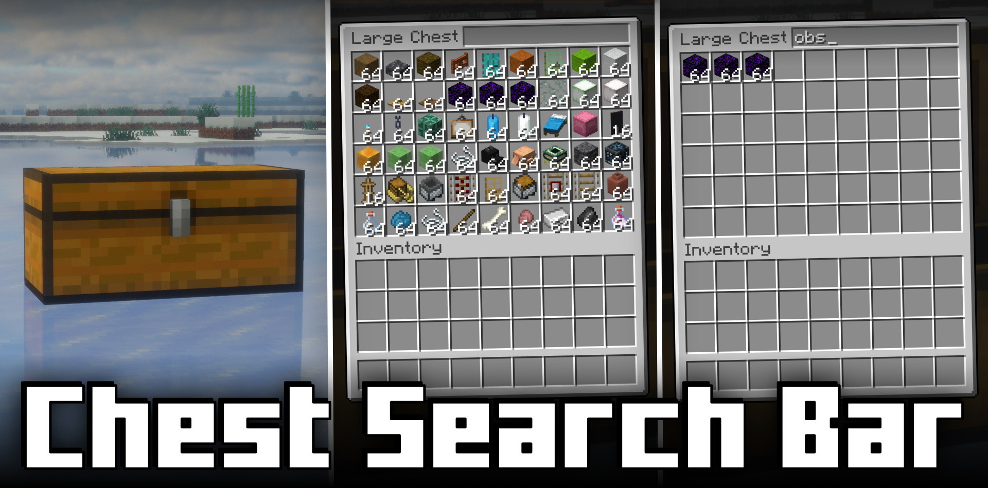 Когда хранилища переполнены, поиск нужного предмета превращается в утомительный процесс. Chest Search Bar решает эту проблему максимально просто и эффективно. В интерфейсе сундуков и других контейнеров появляется строка поиска, позволяющая мгновенно отфильтровать содержимое. Это особенно полезно в двойных сундуках, шалкер-ящиках и эндер-сундуках, где количество предметов может быть огромным.