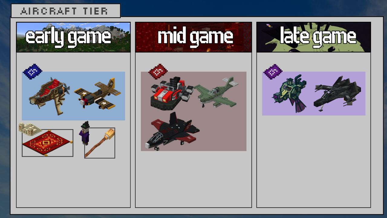 FlyerWork Vanilla Aircraft and Plane для Майнкрафт - универсальное дополнение, которое добавляет много контента, связанного с самолетами. Теперь вам будет доступно сразу 10 видов разнообразных самолетов, начиная с обычного “кукурузника”, заканчивая современным истребителем. При этом будет доступна система улучшений посредством создания различных комплектующих частей.